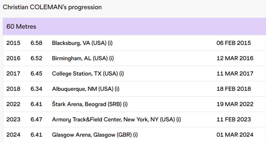 2016年、コールマン選手は、SEC室内選手権(Southeastern Conferenceという、日本で言う関東インカレ、関西インカレのような地区選手権の事ですね)で60mで1位、200mでは2位につける大健闘を見せます。