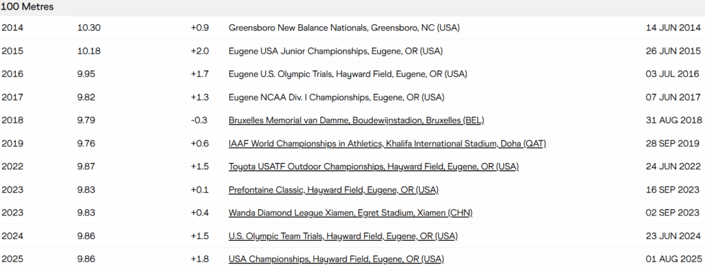 さらにですね、同年の全米学生選手権の予選では、100mでなんと9秒82の全米学生記録をたたき出すのです!(すごすぎる)