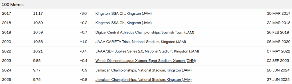 東京世界陸上の代表権をかけた戦いである、ジャマイカ選手権の男子100mに出場したトンプソン選手は、順調に決勝まで駒を進め、決勝では9秒75(追い風0.8m)の世界歴代6位(2025年6月現在)のタイムで優勝を果たします!
